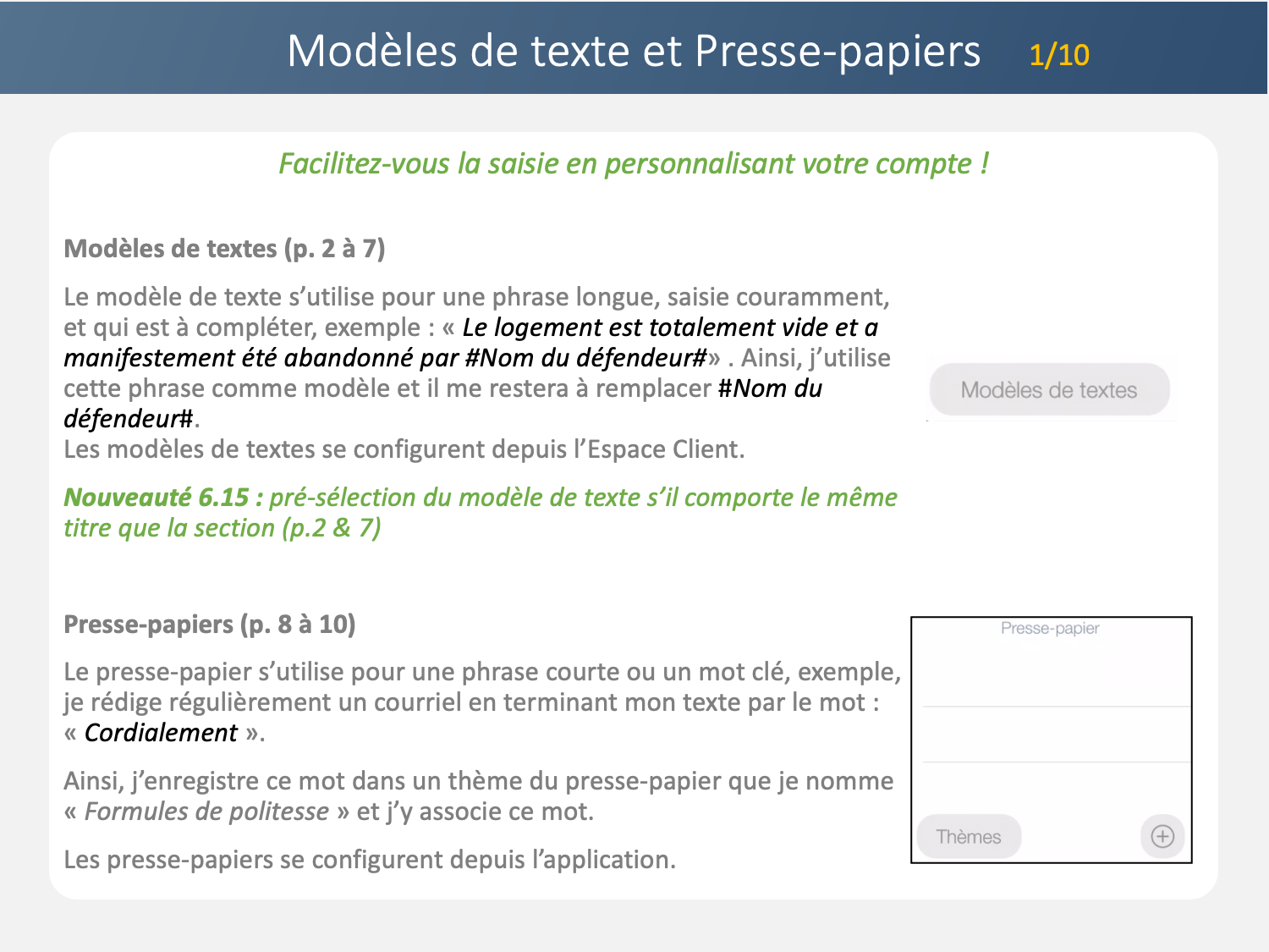 Astuce: Préparez vos phrases, dans le presse papier, pour indiquer vos actions dans chaque sections.