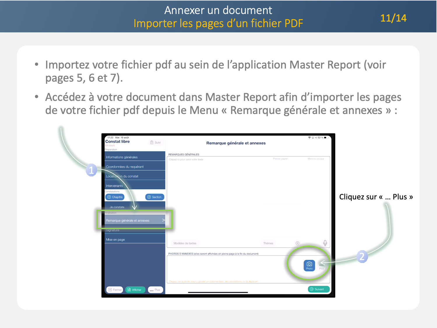 1/ Importez votre pdf dans l’application Master Report (voir document P04. Annexer un document)