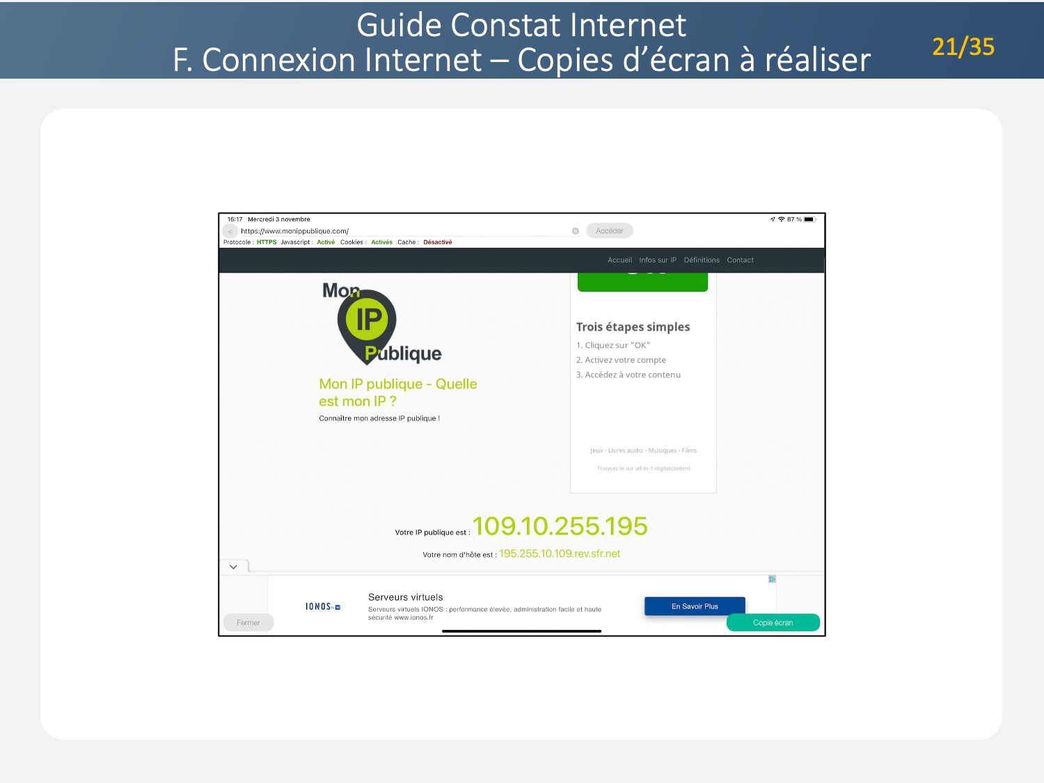 Il est recommandé d’aller sur le site « Mon IP Publique » pour avoir une confirmation de l’adresse IP publique.